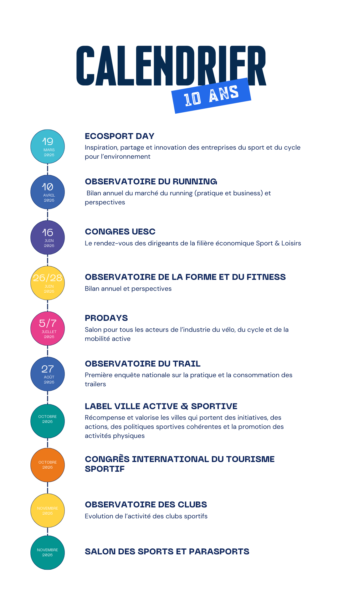 Nos actualités ECOSPORT DAY 2026 L’ECOSPORT DAY de l’UESC revient Jeudi 19 mars prochain : une nouvelle occasion d’information et d’échanges sur l’actualité et les enjeux... Observatoire du running 2026 L'observatoire du running permet d’échanger autour des chiffres et des tendances du moment. La restitution présentera des indicateurs du secteur... Les chiffres clés autour de la filière Sport & Cycle
